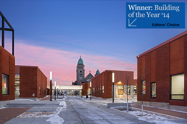 The World-Architects editorial team selected this new school that forms part of a major redevelopment in East Baltimore, an area known for its crime, poverty and drugs. The K-8 school occupies two city blocks, but it is broken down into about a dozen small buildings to create a city within a city and achieve a scale that is in concert with the surrounding row houses. This contextual-modern approach comes across as well in the materials, particularly the brick-colored concrete and translucent glazing.