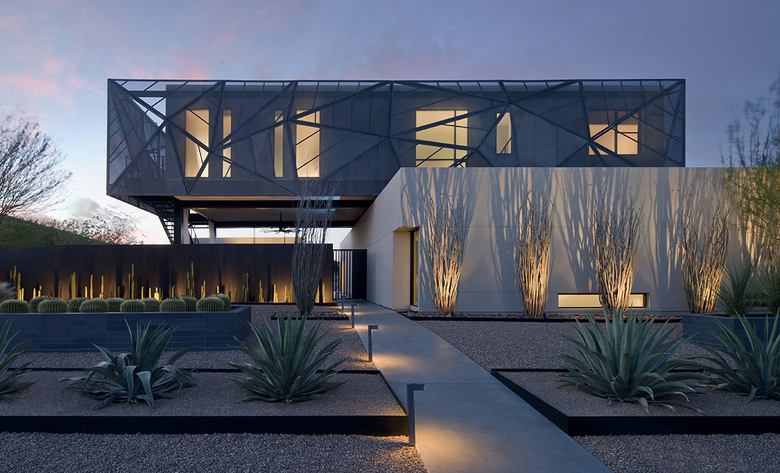 Third place in the public vote is Tresarca, a single-family house outside Las Vegas, Nevada, designed by assemblageSTUDIO. A mesh-covered second story sits above the solid walls of the house's first floor and cantilevers beyond it to create a shaded patio appropriate to the desert climate.