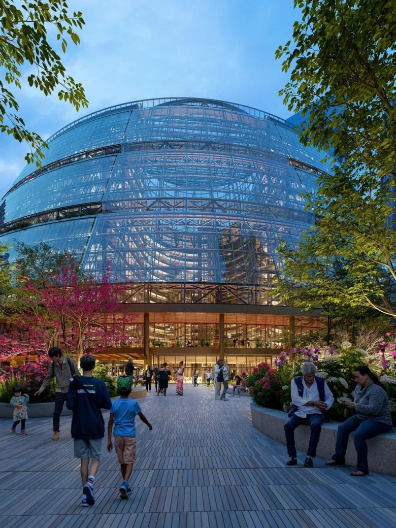 Although the details of the full-height atrium — arguably the greatest architectural asset in the building — have not been revealed in an interior rendering, the views from outside are enough for preservationists to breath a sigh of relief. In comparison to the renderings by Jahn from December 2021, a few months after Helmut Jahn's sudden death, that showed a dramatically reworked atrium, Jahn's new scheme for Google shows the atrium basically intact, particularly as seen in the dusk image. If the space will retain the pastels and other elements that made it Chicago's best example of postmodern architecture is doubtful, especially given that the pink-hued colonnade at the base of the building “will be redesigned to allow for an enhanced ground floor experience,” in turn losing its PoMo character. This statement by Google further indicates dining and/or retail may occupy the previously covered open space that was an extension of the plaza, but it's still unclear how much of the grand interior will be publicly accessible. In its roughly thirty years as a public building, the atrium and below-grade food court were public spaces, their frequent use further enabled by direct connections to six “L” lines. But so far, reports only indicate that the “L” connections will remain in the redesign, while the accessibility of the rest of the atrium is still a glaring question mark.