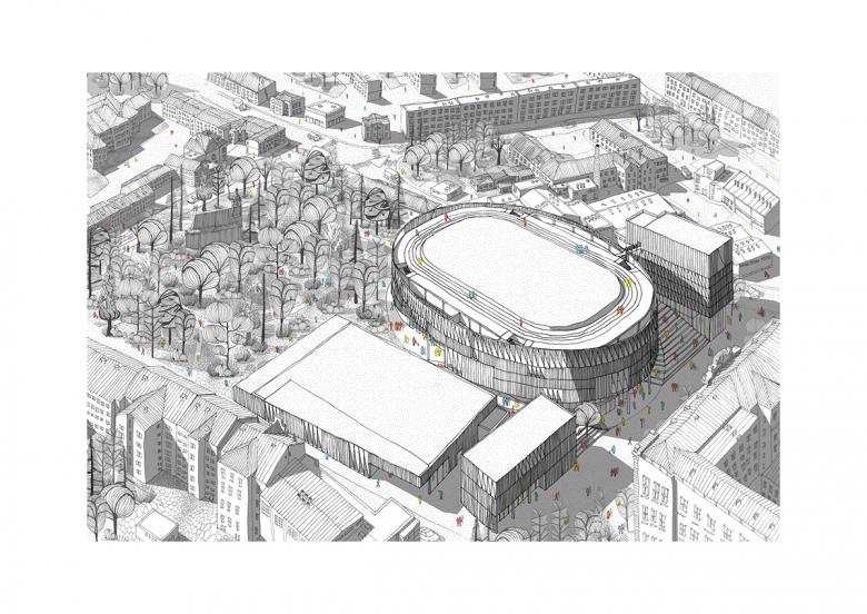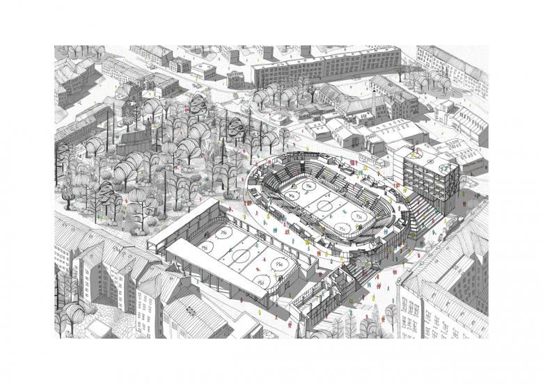 Chybik + Kristof's winning design will be built upon the deteriorated remains of a sports arena dating back to 1956. Per a press release, the new arena will "expand into a four-building multifunctional center bringing together an adaptable ice rink, a rooftop running track and a gym as well as a sports academy, hospitality establishments and shops." It is intended that the four-building "urban stadium" — two of the four buildings already exist — will "melt" into the surrounding urban landscape, which is on the edge of Jihlava’s historical core.