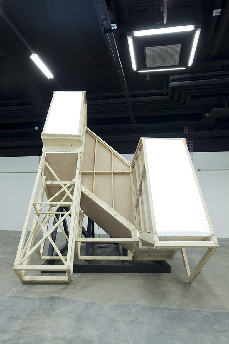 CKÖ's "The White Cube" is commended in an awards statement as "a room-within-a-room installation ... skillfully transformed into an inaccessible object. The slanted segment of the spatial construct leans against a massive substructure and appears, in contrast, light and provisional. The deep engagement with materiality, construction, accessibility or even functionality helps to render this object enthralling."