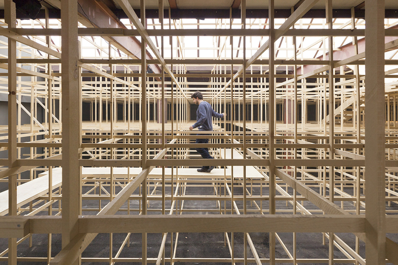 CKÖ was formed in 2012 "out of joy for doing." With backgrounds in architecture, the art collective has created works of different scales and media that are often at the scale of rooms or interact with buildings in interesting ways. Their first piece was an intervention in a vacant building in Zürich, and most recently they intervened at the Kunsthalle Arbon, filling a hall with a wooden grid that visitors traversed.