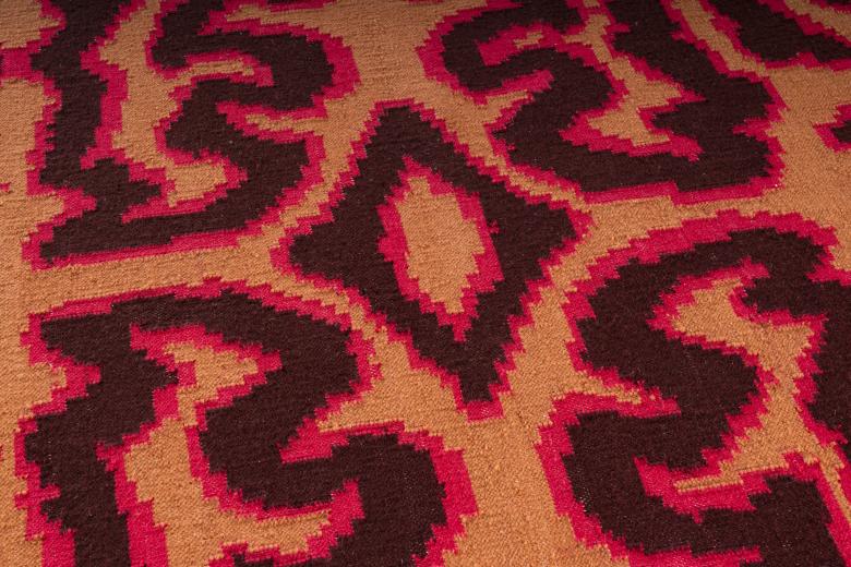 Textiles at the interface between craftsmanship and digitality: Drawings are transferred into digital renderings and then implemented as jacquards or embroideries. Typical features include glitch-like motifs, pixelated color gradients, and digitally altered hand drawings. (© Piercarlo Quecchia | Photo: Stefania Ruggiero, Ember rug, kilim technique, Delvis (Un)limited, 2024)