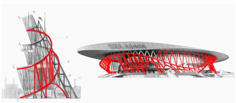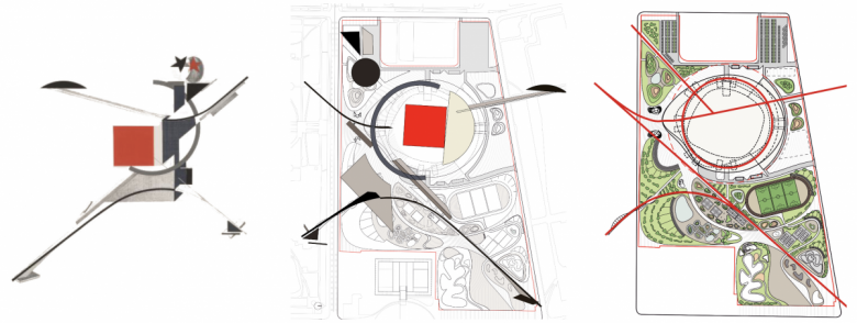 Illustrations accompanying the usual realistic renderings show how the architects took an image of El Lissitzky's The New Man — a ca. 1920 artwork based on a 1913 Russian opera called Victory over the Sun — and applied it to the site plan of the large park, interpreting the arms and legs of the figure as axes in the park. Another one shows the curving lines and structural supports of Tatlin's Monument to the Third International transferred to the expressive "filigree framework" of the arena's external structure.