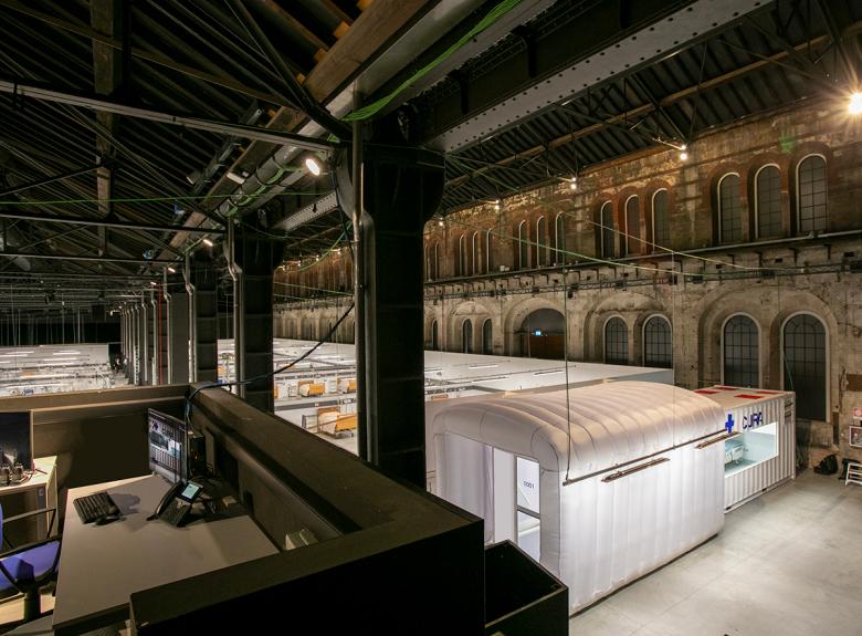 Photographs of the prototype show the container attached to an inflatable structure that serves as storage and changing room, what in the initial design was a corridor which connected multiple containers. CURA is installed in a former industrial shed next to 90 beds in an open-plan configuration. The greater area given the latter does raise the question: How quickly could CURAs be produced to fill the same amount of space if needed? Hopefully the downward trend of cases in Italy continues and such a need does not arise.