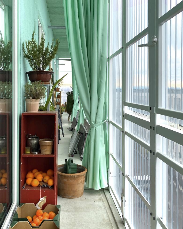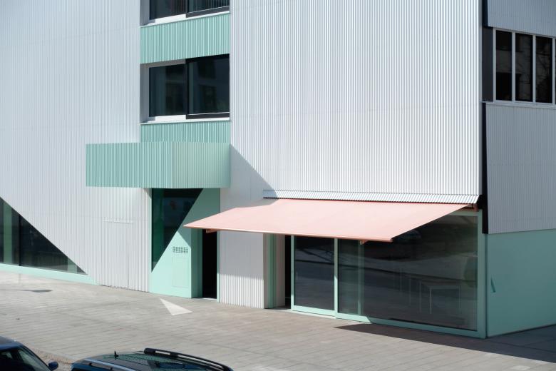 The six-story building is faced with corrugated panels: polycarbonate on the long west facade, where it fronts a glass facade and movable French doors; and solid white on the short entrance facade. Commercial space is located on the ground floor, with a communal "lobby" for the residents who say it resembles a covered play street, per DAM's announcement of the 2022 prize. A communal kitchen, workshop, laundry and storage comprise parts of the communal lobby. Five residential floors are upstairs, plus a roof garden with raised planters and a summer kitchen on top of the building.
