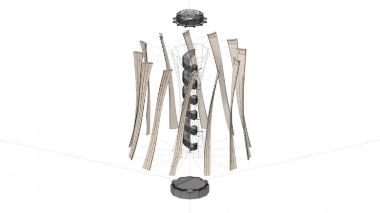 Thanks to their curvature, which provides additional stiffness to the timber surface, the tower's twelve cross-laminated timber segments were erected in just a few days. The viewing platform is reached via 113 steps, with the staircase column absorbing the vertical traffic loads.