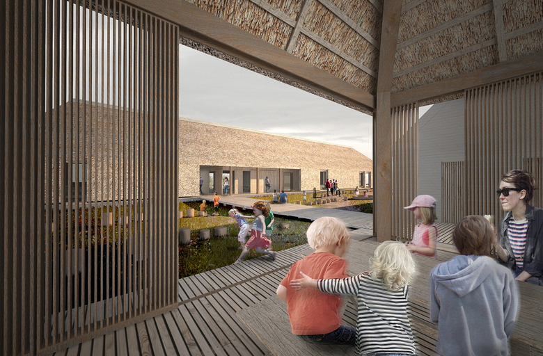 Dorte Mandrup Arkitekter's design interprets the local building tradition, particularly rural farmhouses, by covering the walls and roofs of the 1,000-sm (10,750-sf) building with thatching. This approach pleased Esbjerg Mayor Johnny Søttrup, the head of the selection committee, who said, "It has been of great importance that the architecture is in harmony with the vast, horizontal landscape of the marsh as well as being significant and one of a kind."