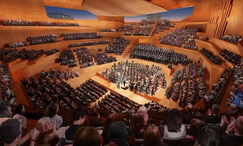 The foyer would be abuzz day and night, filled with activity and glimpses into the inner life of the Hall. We imagine a concert hall for the 21st century that embraces both a bespoke and a loose fit approach: tailored for exceptional symphonic sound, yet agile enough to accommodate creative work across disciplines and genres.