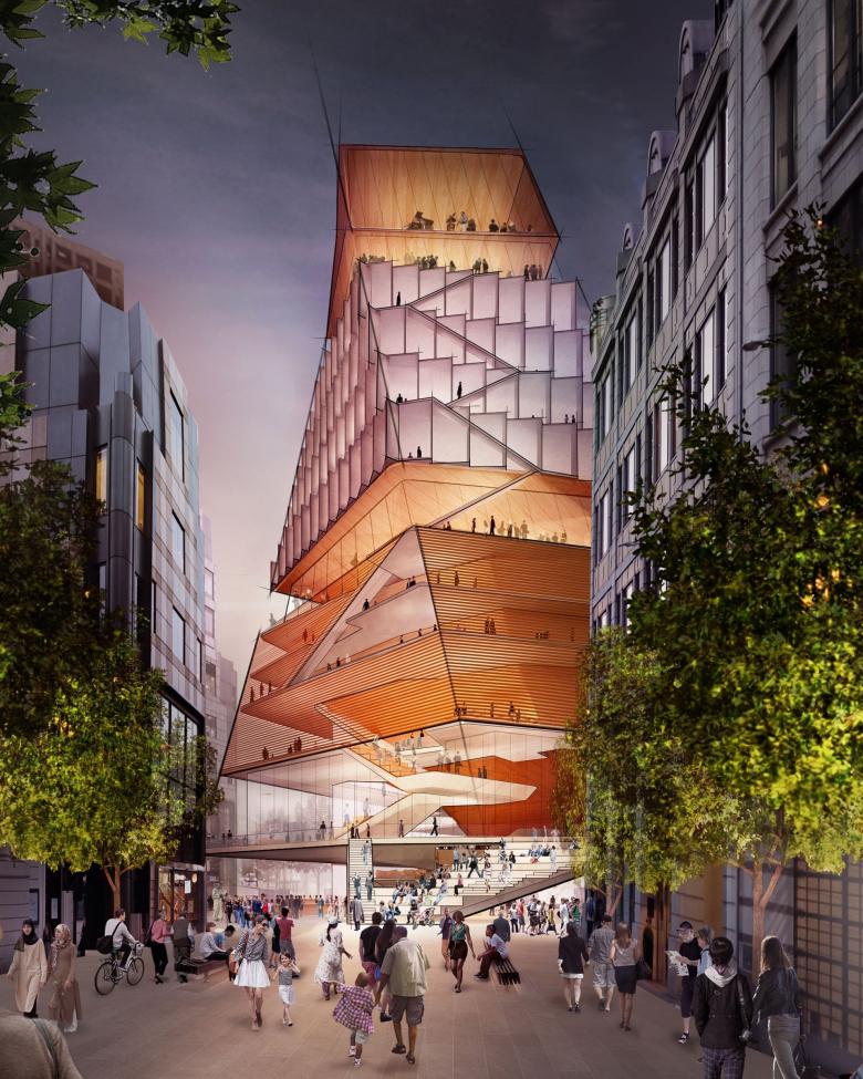 As is often the case with rendering reveals, first impressions prevail. In the case of DS+R's first foray into the UK, the overall rendering recalls both the Tate Modern by Herzog & de Meuron and DS+R's own Roy and Diana Vagelos Education Center in New York City. The first, just across the Thames in London, has a twisting pyramidal form that DS+R must have known their design would be compared to; while the second, completed in 2016, similarly places circulation along its exterior and behind clear glass walls to activate the facades and free up functional space behind them.