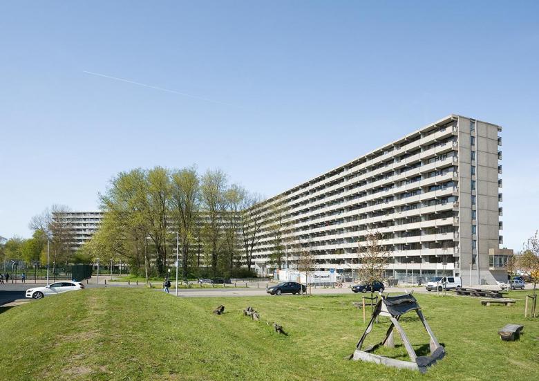 The DeFlat project by NL (the 2005 Emerging Prize winner) and XVW for client Kondor WesselsVastgoed involved the renovation of one of the largest apartment buildings in the Netherlands. Located in Amsterdam's Bijlmermeer neightorhood, the 400-meter-long bend slab has 500 apartments across 11 floors. The project saved the building from demolition by turning it into a so-called Klusflat, whereby the tenants renovated the apartments themselves. Therefore the main structure was renovated but the apartments were left unfinished in order to minimize up-front costs. The project also included the reversal of 1980s renovations that were not in keeping with the CIAM-inspired original.