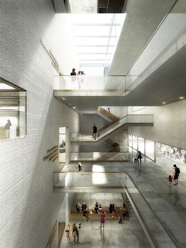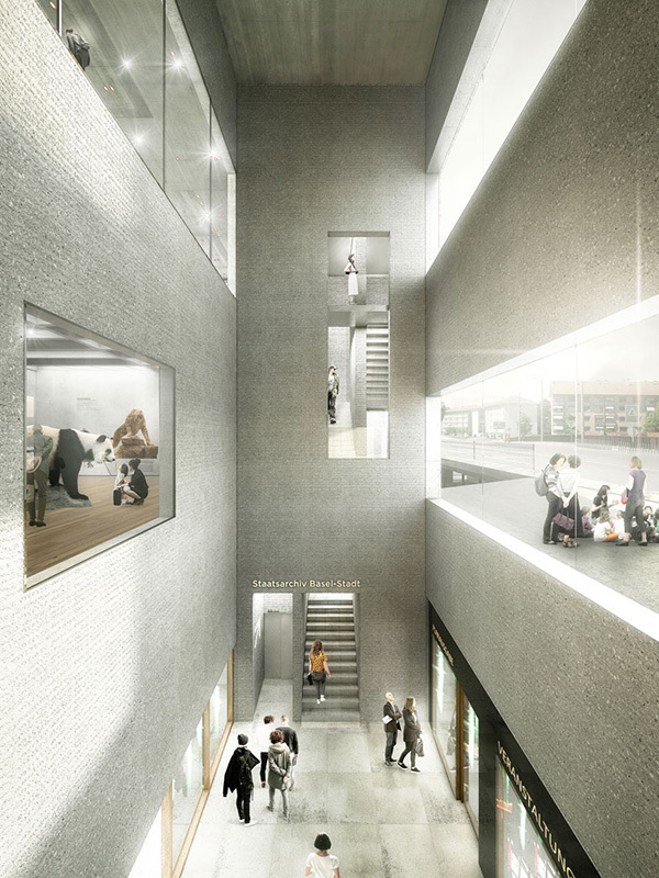 The project Zasamane was awarded first prize in the competition for the new building to house the Museum of Natural History Basel and the State Archives Basel-City. This unique storehouse of information, which in the future will combine knowledge about nature and culture, takes the form of a staggered, elongated building with a tall, slender tower that provides an urban symbol for both institutions. Nevertheless, the two individual identities are of central importance: strong spaces will create distinct addresses for both functions and make each of them clearly recognizable. The principle of adding and layering forms a general leitmotif that can be recognized externally and is continued in the interior structure of spaces. It is planned to begin the erection of [the] new building in 2018.