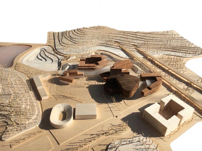 EMBT's scheme is made up of multiple interconnected buildings that correlate to the general program: performance, learning, and living. The auditoriums consists of a rehearsal hall with 200 seats, a 500-seat concert hall, and a main theater with 700 seats; visible from a distance, the last formally serves as the "protagonist" in the Conservatory composition. Other program spaces include classrooms, a library, administrative spaces, and a dormitory. EMBT describes their competition-winning design as "a living organism in which all parts are interconnected, in which education and creativity flow and share space."