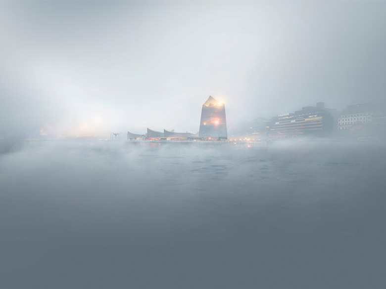 GH-76091181 "comprises a ring of slender, sculptural towers faced with timber shingles, reminiscent of vernacular architecture, gathered around a cathedral-like central space. The towers, with their play of light and shadow, create an architectural beacon, visible by land or sea, while the central space, sheltered from extremes of weather yet part of the quayside, provides an exceptional new site for public events on the waterfront. Exhibition galleries are housed in timber cabinets stacked within the towers. Bridges connecting the towers offer breathing space for visitors between experiencing art and offer new viewing points over the city and harbor."