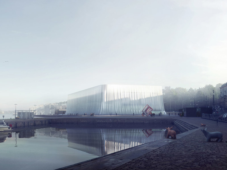 GH-121371443 "drapes a skin of textured glass panels over a bar-like, two-story interior structure, creating an environmentally sustainable public space between the facade and the gallery volumes, with natural light diffused throughout. In an unusual innovation, the element that makes the building sustainable—the intelligent glass wrapper, which uses technology such as Nanogel glazing and rollable thermal shutters—is also the element that distinguishes the project visually, giving the building an ethereal presence. Within the building, an annex for the work of younger Nordic artists is paired with a market hall, and a service pavilion encloses a sculpture garden."
