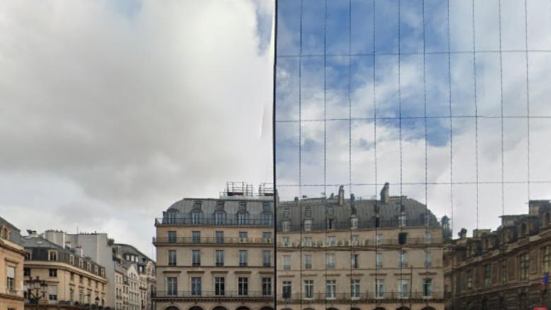 In 2023, the plaza in front of the soon-to-be Fondation Cartier home was the site of a mirror-glass installation by Jean Nouvel — reflecting the adjacent facades but also hiding construction equipment. (Photo: Google Maps)