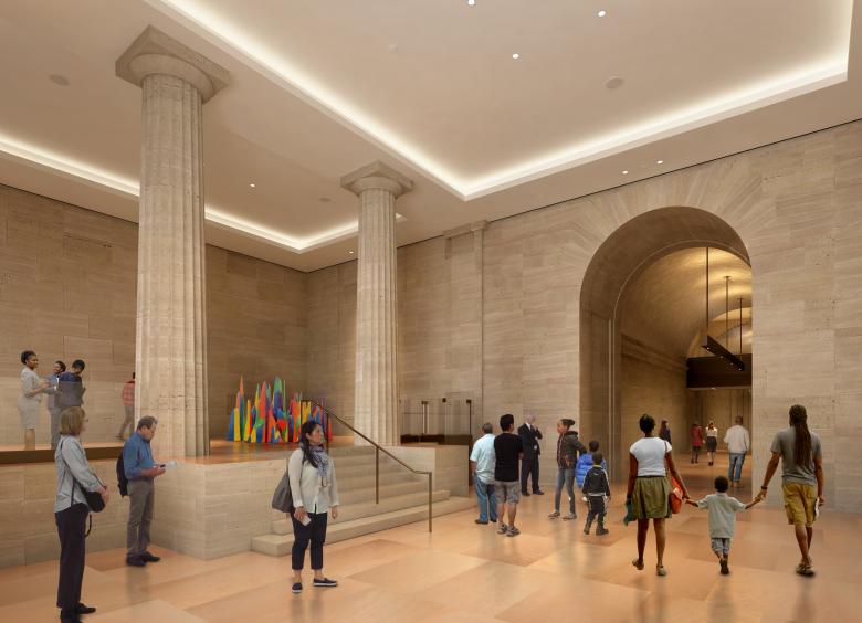 Some notable interventions in the energy-efficient, ADA-compliant Core Project include: renovating Lenfest Hall, where most people enter the museum; creating the Williams Forum, a new event space and connection to the museum's upper levels; and opening up the Vaulted Walkway, which spans the entire breadth of the building, to the public. These and other spaces can be grasped in the cross-section that dates back to at least the 2014 exhibition.