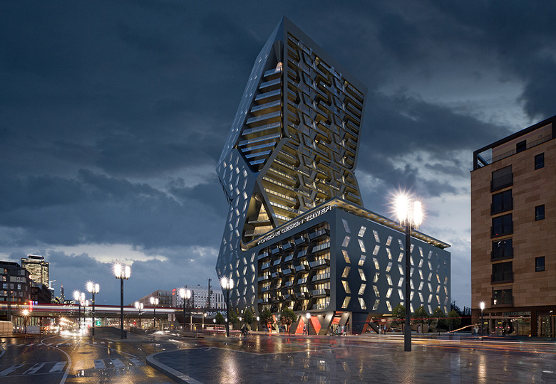 The Porsche Design Tower is billed as "Europe's first branded building," with features that include fully furnished "Porsche Design Suites," exclusively designed boutique apartments, and an "unusual multi-level car park with electric charging stations and car-sharing opportunities." From the twenty architecture firms in the closed competition, which included six invited firms (five completed designs, their entries highlighted at bottom), the jury* selected one winner and three runners-up: