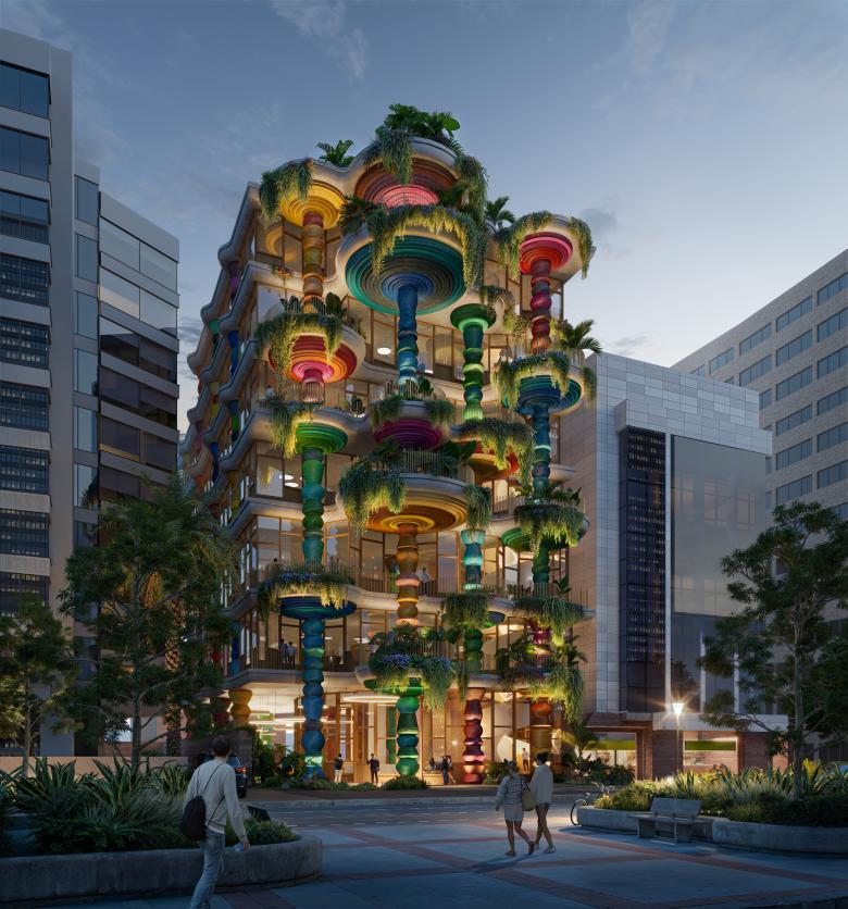 As revealed in a trio of renderings, the design of the seven-story building on Calle 72, one of Bogotá's main arteries, is recognizably Heatherwick; its rounded balconies supported by flutes and draped in green recall the studio's 1,000 Trees, Little Island, and Nanyang Learning Hub, among other built projects.