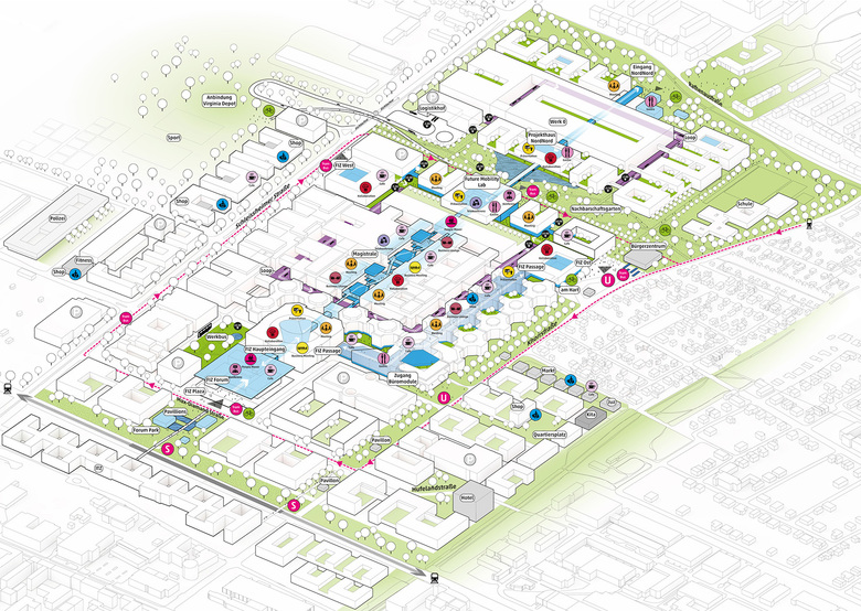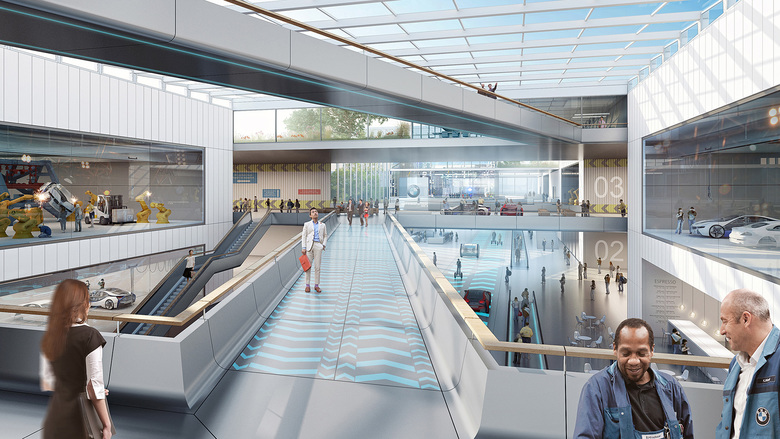 From HENN: People working in a huge variety of specialist fields will need to meet and pool their thoughts to create the innovations of tomorrow. A central axis accelerates movement and provides an enhanced spatial experience to encourage a greater number of such encounters. All cultures of expertise in automobile construction and mobility are always on view. Towards the edges of the campus, this perception reduces and becomes more focused to allow the various specialist fields and disciplines to further develop their ideas. This effect also promotes integration with the surrounding urban quarters. Here, the design of the new BMW FIZ opens up to its neighbors with a park, cafés, leisure and sports facilities as well as a civic center.