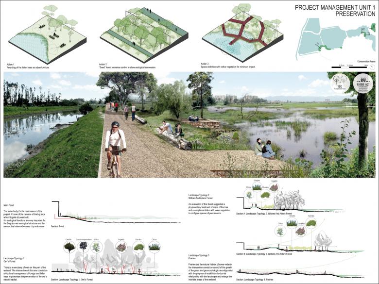 "This project aims to consolidate the Jaboque wetlands. The consolidation is achieved along a 5.5 km-long linear park that integrates recreational and natural areas and offers educational opportunities for the community. The landscape planning was used as an opportunity to create a live botanical collection. Plants were selected depending on their impact on the ecosystem and their potential to strengthen the wetland flora and fauna."