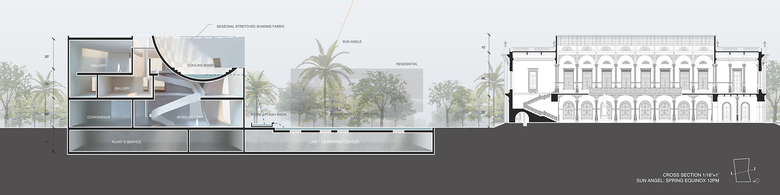 The basically orthogonal galleries are given a sense of flow and spatial overlap from the light cuts. The central cut forms a shaded monsoon water basin which runs into a central pool, related to the great stepped well architecture of India. The central pool joins the new and old in its reflection and provides sixty percent of the museum's electricity through photovoltaic cells located below the water's surface. The white concrete structure has an extension of local rough-cut Indian Agra stone. The circulation through the galleries is one of spatial energy, while the orthogonal layout of the walls foregrounds the Mumbai City Museum collections.