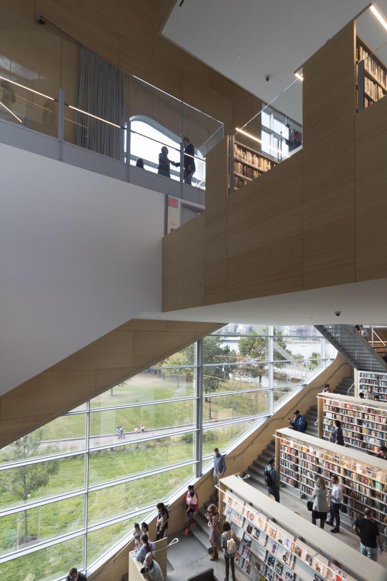 Six years is a long time for justice, but in the context of Hunters Point Library it is relatively short. Steven Holl's ambitious design of a vertical library, with amorphous openings expressing the complex interlocking spaces behind the concrete facades, began in 2010, but construction did not start until 2015. It would take another four years for the 22,000-square-foot building to open, at a cost of more than $40 million dollars. With a full nine years from watercolors to ribbon cutting, no wonder the September 2019 opening was a joyous affair, with Mayor Bill de Blasio grinning at the view of Midtown Manhattan the vertical branch library affords, and crowds streaming up and down the many stairs overlooking the full-height atrium. Architecture critics heaped praise on the building even before the first book was checked, none more profuse than Michael Kimmelman, whose New York Times column one week before the opening called it “among the finest and most uplifting public buildings New York has produced so far this century.”