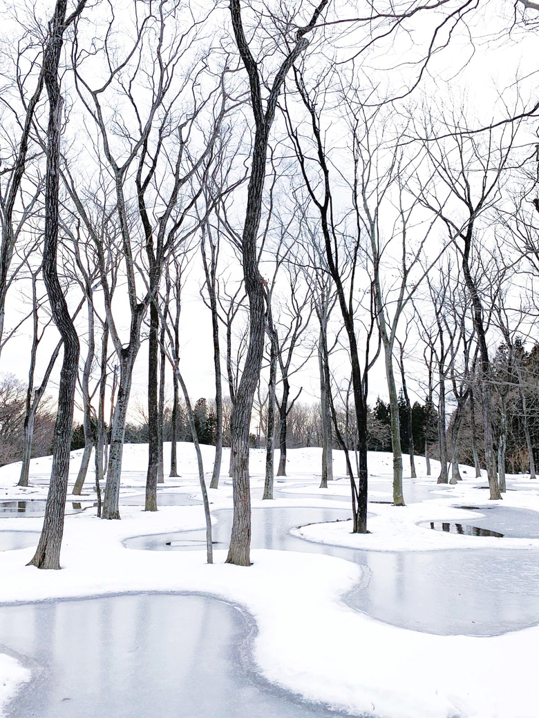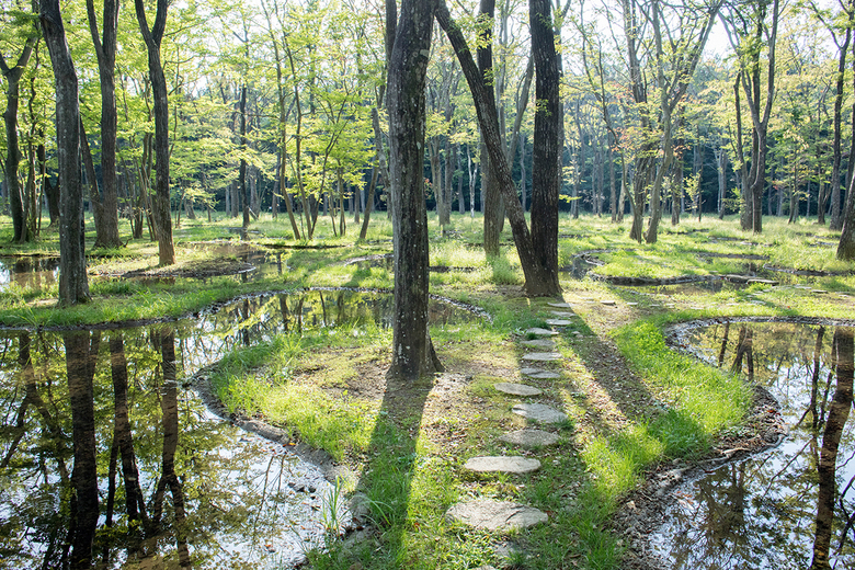 The Art Biotop Water Garden is part of Art Biotop, an art retreat and artist's residency in the foothills of the Nasu mountains north of Tokyo. The garden — a combination of landscape architecture and land art — entailed replanting more than 300 trees (saved from the construction of a hotel at the retreat) and the creation of 160 biotopes (artificial ponds) amongst them. The effect is like a flooded forest, the water reflecting the canopies overhead. The only other materials are moss between the trees and ponds, and stepping stones for traversing the garden. Like any natural — if highly engineered — creation, the Art Biotop Water Garden changes day to day, season to season.