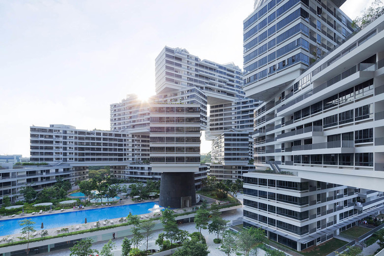 Like an oversized version of Moshe Safdie's Habitat 67 in Montreal, The Interlace is a symmetrical arrangement of modular blocks – 31 apartment blocks, each six stories tall and 70 meters long – that overlap to create roof terraces and unexpected vistas. The Interlace is a striking departure from the typical residential projects in Singapore, which are groupings of isolated towers sometimes connected by upper-level walkways. The hexagonal arrangment of blocks results in shared terraces that add a social dimension throughout the numerous private dwellings.