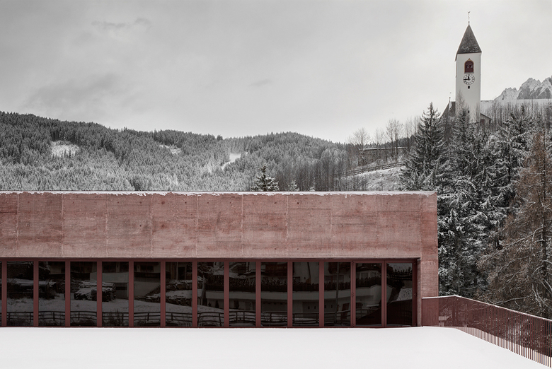 An honorable mention was given to Pedevilla Architects' Fire Station in Vierschach, Italy. The jurry commented: "It has attractive and intelligent section solution. With simple volume of the new object architects established a suggestive relationship with nature and topography where little church in behind keeps it dominant role."