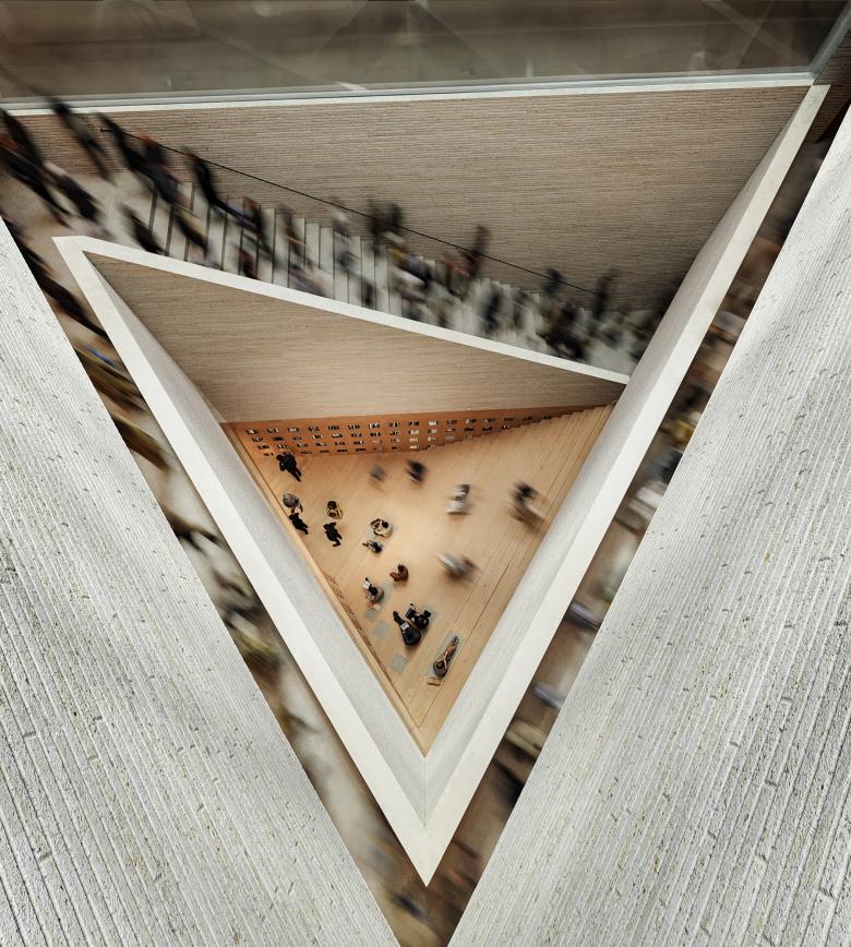 Throughout the competition process, the jury and public provided comments on the designs. In the first stage, the Kumma entry was seen as “closed and heavy,” with the facades “lack[ing] the desired degree of openness” and the lobby receiving “insufficient daylight.” These and other concerns were addressed in the second stage design shown here, with the jury finding an “improved” plan, “softened” facades, and new openings providing “inviting views.” Still, the jury asserted, “sharp corners, the monumental staircase, and the triangular geometry continue to raise concerns regarding usability and accessibility.” Regardless of this and any further critiques, “Kumma demonstrates strong potential to become a distinctive and memorable museum.”