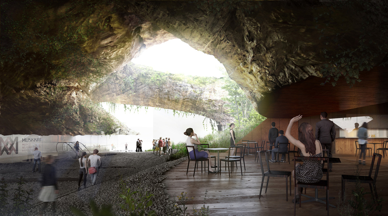 In views from the street and in the café, the renderings make the building appear invisible, lost amid a natural rock formation. Yet the natural rock formation IS the building, an arching structure with a waterfall, pond and tropical plants at its center and climbing plants covering its exterior.