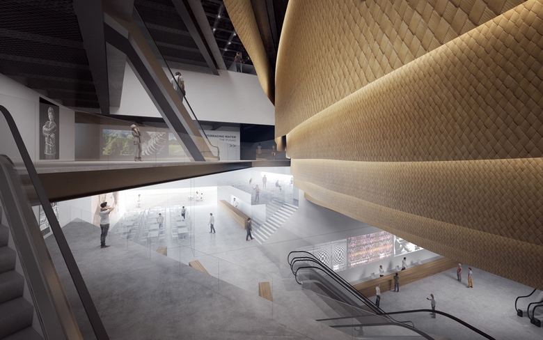 Kuma's firm is quoted at Dezeen: "Based on its concept, we aim to build a natural and organic museum by combining water and green in the cave-shaped space, contrary to the image of museums as closed boxes. It is also an attempt to revive cohabitation of nature and history in the urban environment."