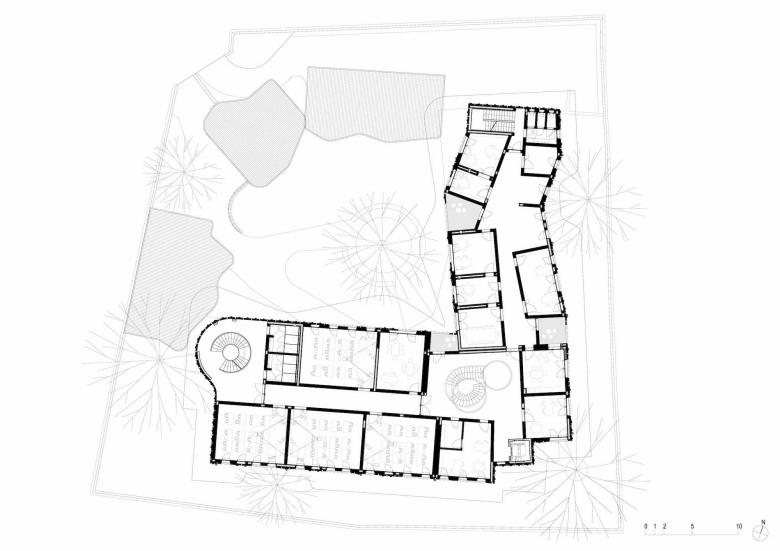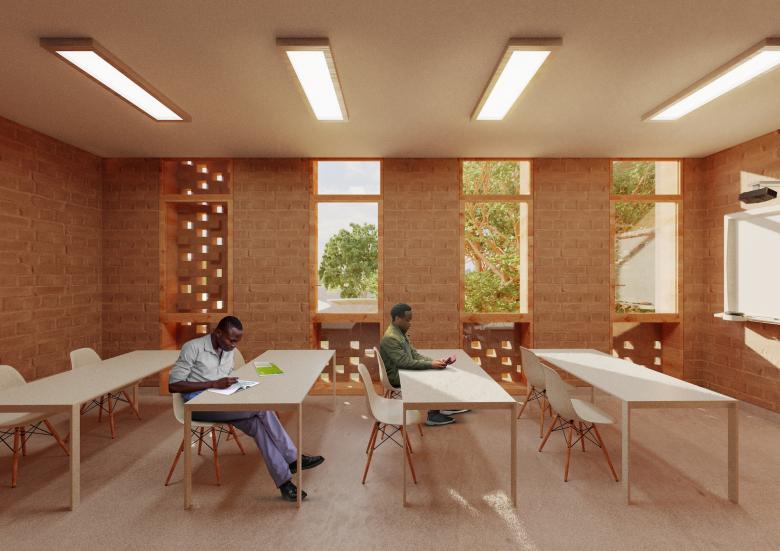 Exhibitions and language courses, concerts and conferences will take place in a two-story building shaped to mirror the outline of the canopy of trees on the site. The structure will protect the occupants and visitors from noise, particularly traffic. The structural walls are made are made from local compacted earth blocks (BTC). An outer, partially translucent brick skin ensures a light appearance for the elevations.