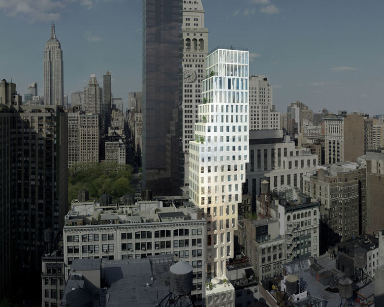 The closest Koolhaas came to realizing a building in Manhattan was with 23 East 22nd Street, a 350-foot-high residential tower squashed by the 2008 recession. The design appeared like something out of his landmark 1978 book Delirious New York, in that it stepped like many buildings in the city do in response to zoning codes, but it did so in a completely different manner, leaning around an adjacent building to catch a glimpse of Madison Square Park.