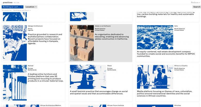 In their words, the studio's ongoing Non-Extractive Architecture project focuses on “rethinking the balance between the built and natural environments, the role of technology and politics in future material economies, and the responsibility of the architect as an agent of transformation.” For the directory, Space Caviar worked in close collaboration with the Practice Lab at re:arc institute: “a non-profit philanthropic association working at the intersection of climate action and architecture philanthropy, the platform curates a network of support and information exchange for individuals, practitioners, communities, and institutions worldwide interested in participating in the creation and amplification of more equitable paradigms in architecture.”