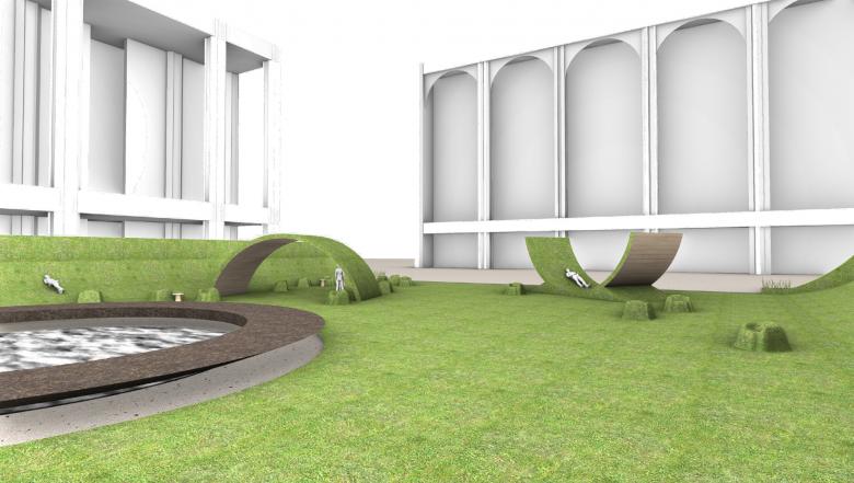 When it opens on May 10, "The GREEN" will be the centerpiece of Restart Stages, Lincoln Center's "initiative to help kickstart the arts sector and New York City’s revival," which will turn parts of its campus into "an outdoor performing arts center." Lien envisioned the temporary installation as "a more inclusive and inviting environment" that changes the ground surface "from hard paving stones with no seating to a material like grass," where "suddenly anyone would be able to sit anywhere."