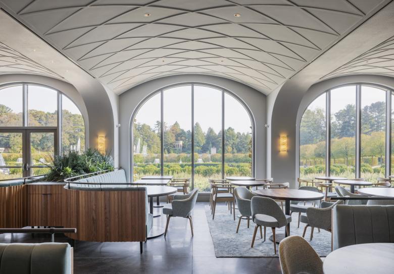 While some of the elements, such as the Waterlily Court to the east of the West Conservatory, will be completed in spring 2025, the 1906 Restaurant opened last month, ahead of the Longwood Reimagined ribbon cutting this Friday. Tucked below a new grove of trees that sit adjacent to Longwood's historic conservatories, the restaurant's sizable arched windows look onto the fountains whose shows are one of the main draws for visitors. This space with views of the landscape and water feature is but one example of how Longwood Reimagined integrates itself into Longwood Gardens while also reimagining it.