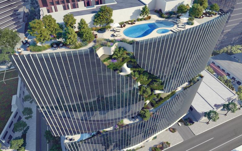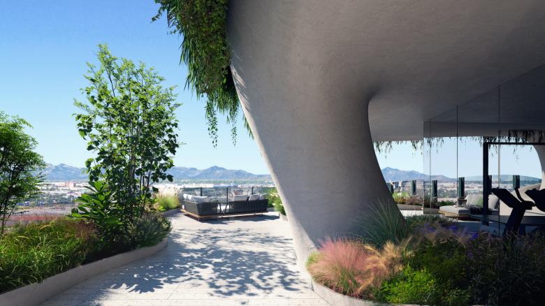 Now under construction at 40th and Blake Streets along the eastern edge of Denver's River North District (RiNo), One River North is a 16-story building that will house 187 rental apartments and ground-floor retail space when it is completed toward the end of 2023. The main design gesture, as clearly evidenced by the renderings released by the team of developers behind the project, is the 10-story "canyon" that is meant to "[blur] the lines between the built and natural environments" and "echo the experience of climbing mountainous terrain" in Colorado. Yet only four of the canyon's ten floors will serve as a "trail-like walkway" for residents of the building, with the rest apparently serving as private terraces. The 216-foot-tall building will also have a rooftop with pool, spa, deck, and garden.