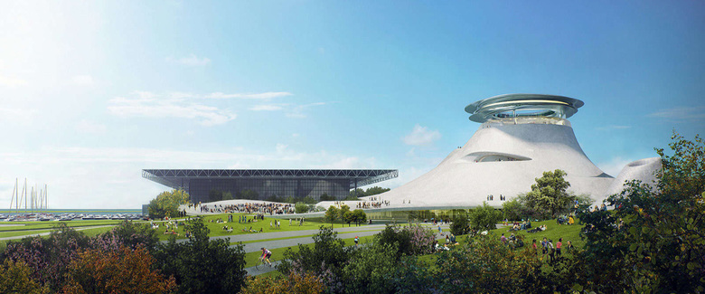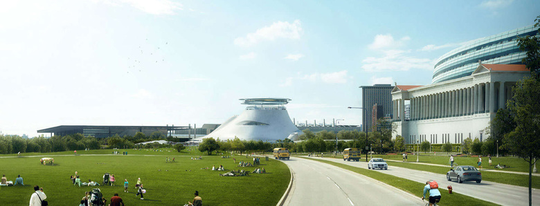 Situated between Soldier Field on the north and the McCormick Place convention center on the south, the design rises from the landscape like an artificial mountain, culminating in an observation deck capped by a "floating" disc. The top of the disc is approximately 110 feet (33.5 meters), or roughly halfway between the 2003 Soldier Field addition (151 feet / 46 meters) and the 89-foot (27-meter) space-frame roof of McCormick Place. Inside will be three levels of exhibition space in "infinite loops," designed to "inspire the imagination to ponder endless possibilities, both in content and design," per a statement from the Lucas Museum. Windows are eschewed in favor of an opening at the top that will bring light to what Yansong calls the "urban living room" at the center of the museum.