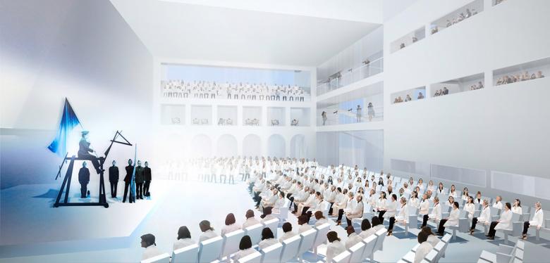 The proposed MAI would have been located in Hudson, New York, inside an old theater that also saw life as a tennis center. OMA partners Rem Koolhaas and Shohei Shigematsu proposed preserving the building's exterior walls, balcony and structure and inserting new floors and spaces for MAI's very unique program: an educational center that would train people to take part in long-form performances of more than six hours, the niche that Abramovic is known for.