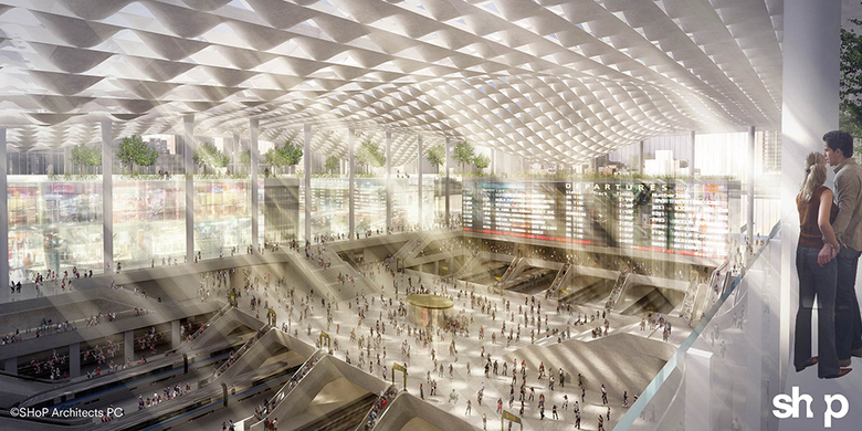 SHoP Architects ended the festivities by wheeling out a huge model (the only one of the four architects) and unfurling a banner at one point to impress the audience at the TimesCenter. In their scheme, MSG is moved to what is now the Morgan Postal Facility, and the High Line is extended to provide entry to the arena and link the elevated park to "Gateway Park" on the Eighth Avenue side of Penn Station. They envision the station as a large open space capped by an undulating trellis that filters light to the interior; more than the other teams, SHoP strives to recreate the grandeur of the McKim, Mead & White Penn Station, though without any classical references.