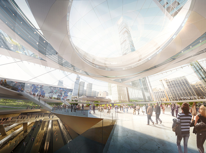 The proposal of Skidmore, Owings & Merrill (SOM) moves MSG to a site south of the Farley building, thereby enlarging the site of Penn Station from two blocks to four. A large glass dome anchors the center of the station over new high-speed rail platforms. Surrounding the dome is a green roof and four towers that anchor the corners of the station. In what may be the proposal's (if not all of the scheme's) most far-fetched idea, a habitable, bridge-like structure spans from tower to tower across the whole site, also topped by a green roof.