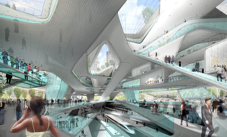 Penn 3.0, the scheme of Diller Scofidio + Renfro(DS+R), uses "intense layering" to add functions that aim to make a visit to Penn Station and the process of waiting enjoyable. They propose moving MSG to the west end of the Farley building, freeing up the two-block site for a "large, sponge-like mass" that is a complex network of platforms and ramps whose legibility is aided by its openness. Through the addition of cultural, office, and leisure activities to the vertical building, DS+R see Penn Station as a "city within a city."