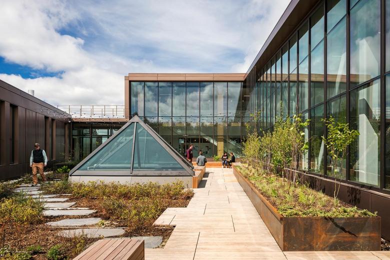 In addition to the CLT structure and the dramatic zipper truss over the central commons, the building's sustainable features also include a highly efficient envelope, mechanical equipment zoned for maximum efficiency, radiant flooring and chilled beams for energy saving, glazing and skylights designed to maximize daylight and reduce artificial lighting, a green roof terrace, and a storm water management system (carried out with Stephen Stimson Associates) that filters runoff from the building and site into the nearby Connecticut River.