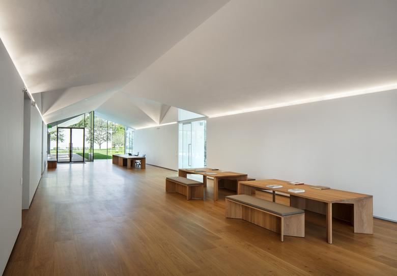 Architects Sharon Johnston and Mark Lee were responsible for the design of the one-story building, while Michael Van Valkenburgh designed the landscape. The building and landscape work together through three courtyards: east and west exterior courtyards, and an internal, cloister-like courtyard. The most striking element in Johnston Marklee's design is the folded steel-plate roofs, which combine with the plain white walls to give the building its distinctive yet modest expression. Inside, the large "Living Room" links the two external courtyards and leads to the relatively small, 2,850-square-foot exhibition galleries. Taking up the rest of the diminutive footprint are a the non-public spaces: the drawing study room, a conservation lab, and administrative offices.