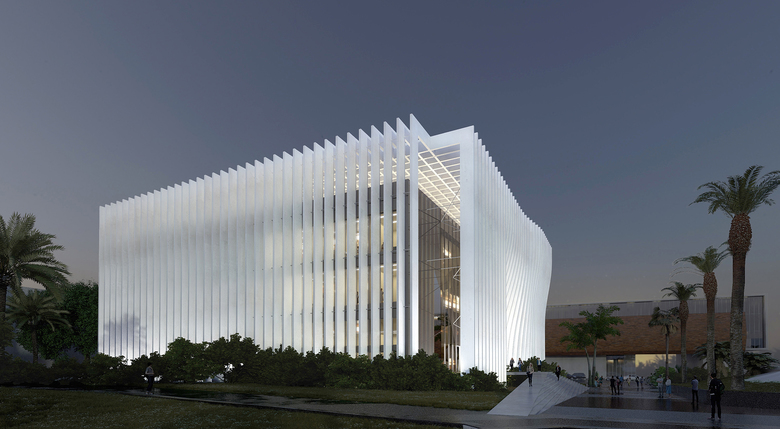 The most distinctive architecture feature of the 6,000-m2 building is the matrix of vertical lines that wrap the three-story glass box. The load-bearing exoskeleton shades the interior while "making an iconic architecture beyond scale."