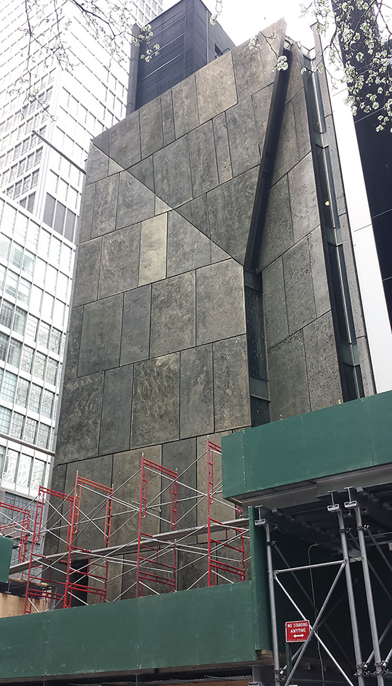 While it took close to a year for the above to transpire, it was only about ten days between MoMA filing for a demolition permit and erecting the sidewalk shed and scaffolding around the building for the facade removal and building demolition. On Friday of last week the facade was still visible about the sidewalk shed, as these photos show, but by the time you read these words the whole front will probably be covered, never to be seen again in its entirety again.