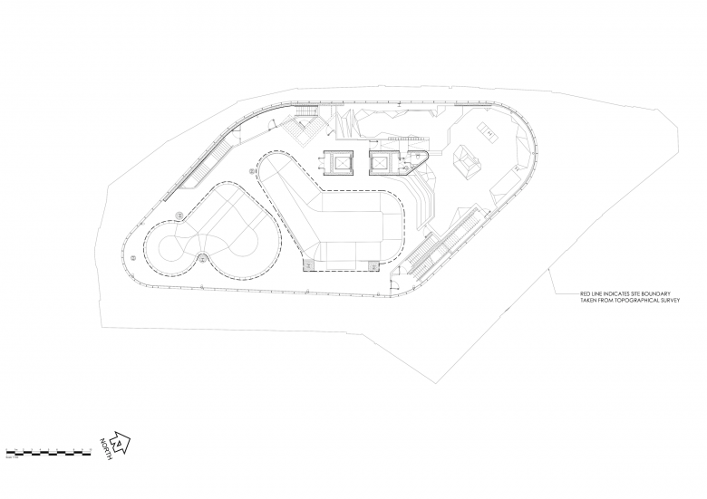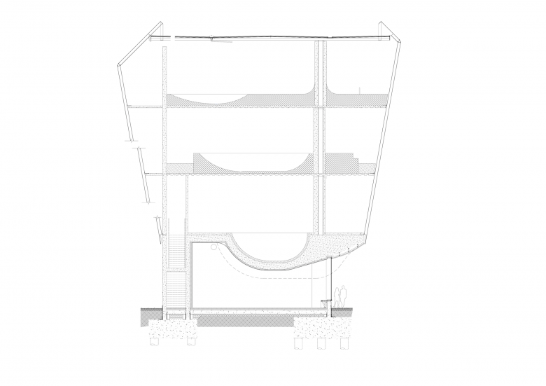 The stacked design by Hollaway Studio, formerly Guy Hollaway Architects, is far from arbitrary: each of the three levels is geared to different types of skateboarding and different skill levels. The first floor is a concrete bowl, inspired by the swimming pools co-opted by skateboarders in Southern California in the 1970s; the undersides of the two bowls are expressed at the ground floor, visible in the photo at top and the building section at bottom. The second floor is made of plywood and is devoted to street skating, with stairs, benches, and railings akin to urban parks and plazas. The third floor — the largest due to the flared form of the building — is a "flow" park with shallow dips made of plywood.