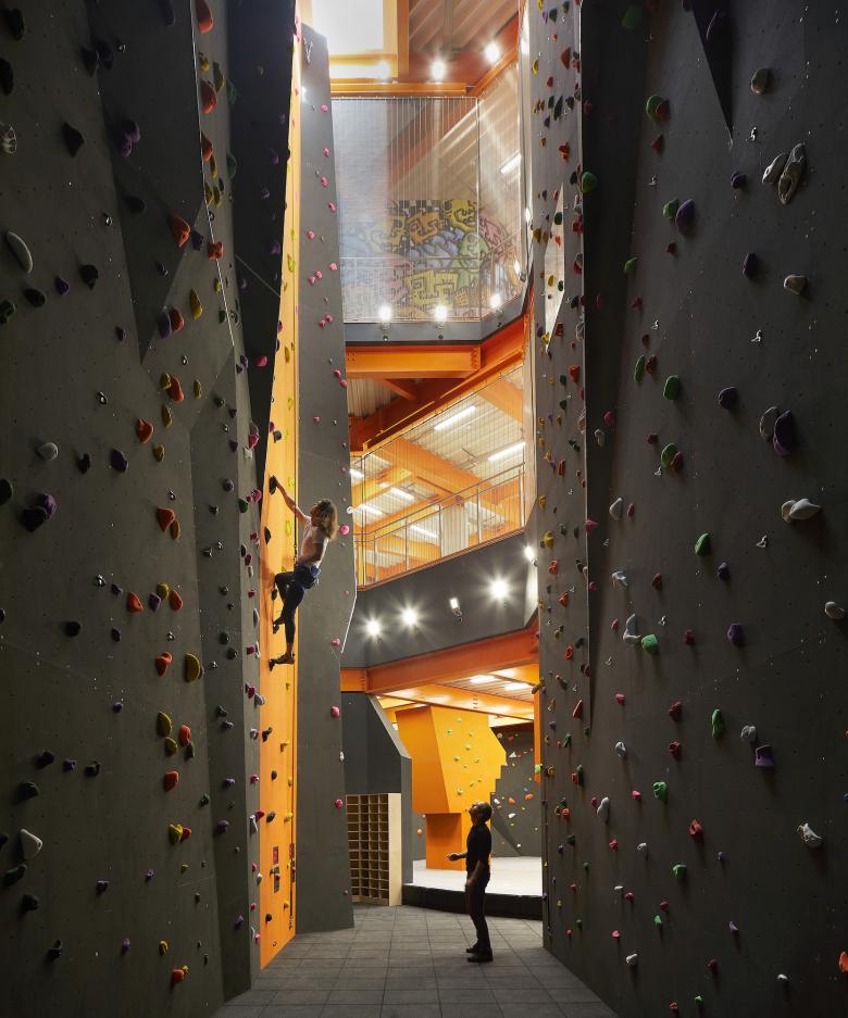 A vertical link between the three skating floors is the climbing wall, the first in Folkestone and, at 15m high, reportedly the tallest one in this corner of England. Not coincidentally, sport climbing, like skateboarding, just entered the Olympic Games in Tokyo last year. Rounding out the offerings, the boxing ring and cafe, that latter of which doubles as a community workspace, are located on the ground floor, sure to activate the town as much as the building's striking form.